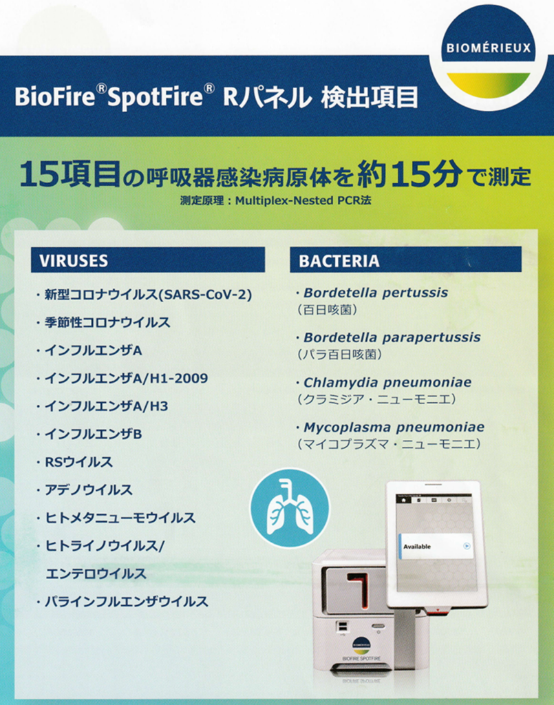 新型コロナウイルス、インフルエンザウイルス、百日咳、マイコプラズマなど15種類のウイルスと細菌を一度に検出できます。